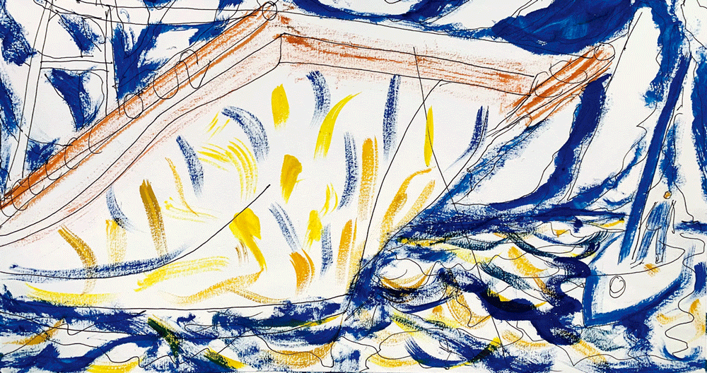 《海上》这批画是孙老师用水彩和签字笔产生出来的新的绘画语言。巨大的轮船、人物胖大的身躯、坚实的巨型铁锚,布满在20×36厘米的小画中一点不违和。高耸的桅杆,飞卷的海浪,炙热的太阳,斑斓的霞光,彰显着画家生命力的昂扬和才华的飞溢,呈现了一个行者艰难的探索和极深的体悟。