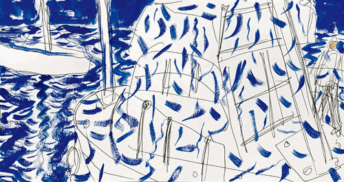 孙静远:签字笔的特征是它会强调骨架,它会强调结构,这是它的特性。水彩的特性就是柔和、充满水滴淋漓的状态。任何一种材料的优点,实际上同时也是它的短板。我为什么要把这两种材料捏合在一起呢,就是想用水彩的柔和弱化签字笔线条带来的刚硬。反过来,签字笔的刚硬也给水彩增加了视觉上的力度,最后呈现出来和传统完全不同的效果。这样就变成1+1>2。人物也好,海浪也好,船也好,实际上就是有限的元素。这批作品数量庞大,大概近千张,我要不停地去改变,我每时每刻都要改变。