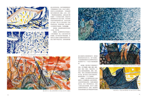 刘文捷:现在看这个画面是很不同的。签字笔硬朗、细腻、果断、漆黑、线条一根是一根的,不拖泥带水。水彩是大面积的透明颜色,鲜艳、柔和、明亮。再加上您的画面本身的构图出其不意。刚才您说了运用不同的材料,最后想呈现出一个什么效果呢?