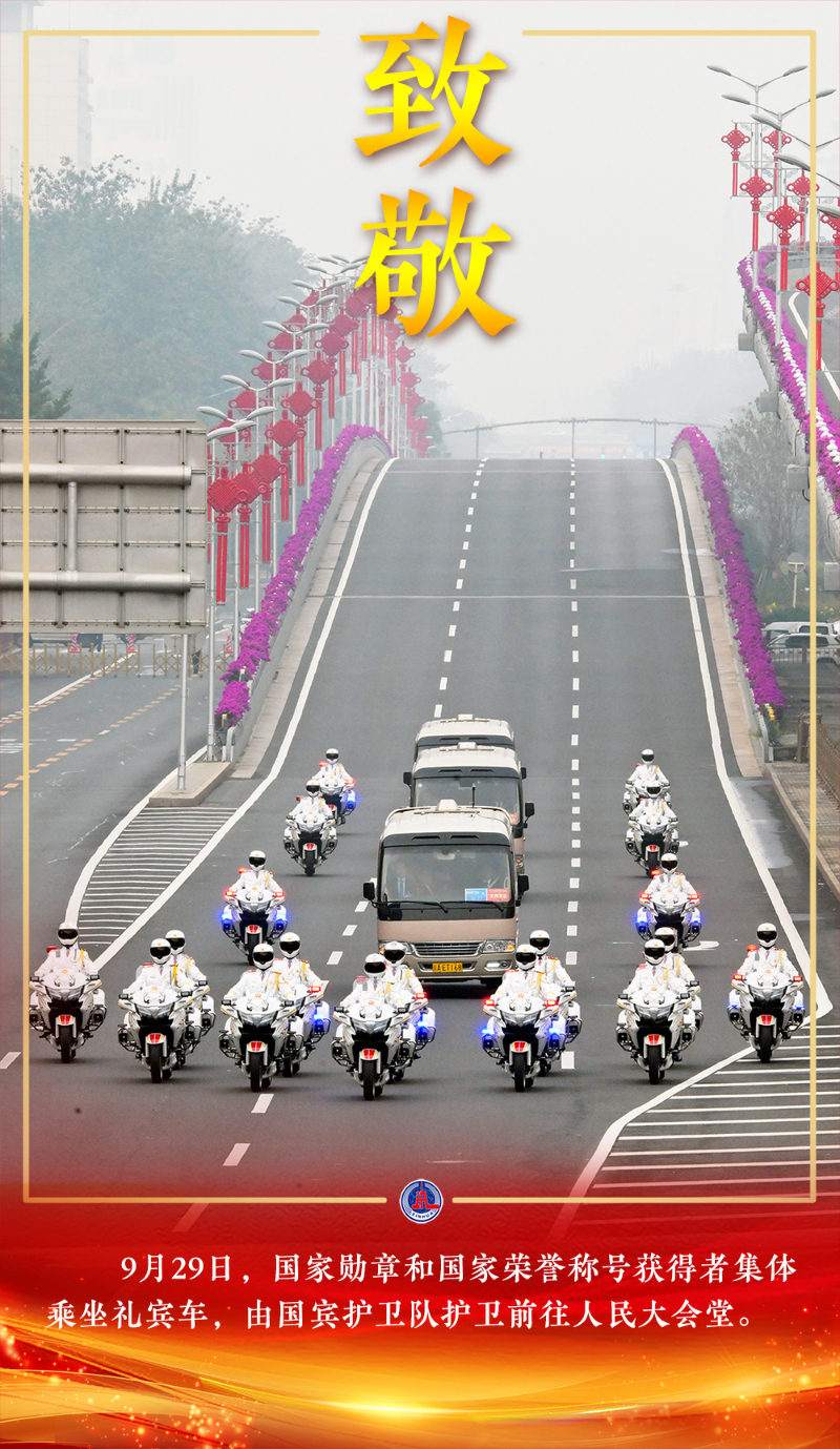 9月29日,国家勋章和国家荣誉称号获得者集体乘坐礼宾车,由国宾护卫队护卫前往人民大会堂。