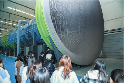 进入实验室,首先映入眼帘的是蓝绿相间的巨大“喇叭”,也是今天的“主角”——建筑风洞。“风洞长96.5米,是直流下吹式大气边界层风洞,可以进行多项科学试验,为保证建筑的安全性和舒适性提供强大的后盾。”在薛原博士的带领下,参观人员来到“喇叭口”了解风洞动力段的运行原理,近距离