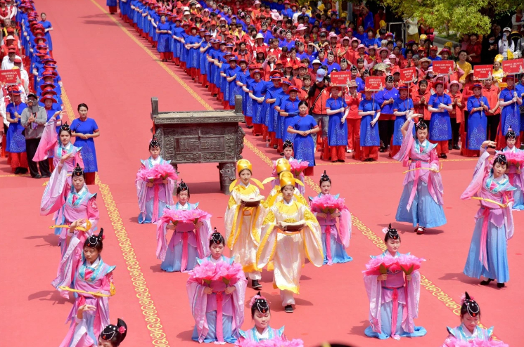 当天上午10时,中华妈祖文化交流协会懿明楼广场编钟奏响,旌鼓擂动、礼炮齐鸣,妈祖春祭大典正式举行。在通赞的主持下,迎神曲随即响起,由主祭人率众陪祭人,遵照传统礼仪,向妈祖行“三献”礼。随后,伴随着一阵礼乐响起,由湄洲湾职业技术学院师生为现场观众献上一场肃穆典雅的“三献之舞”。
