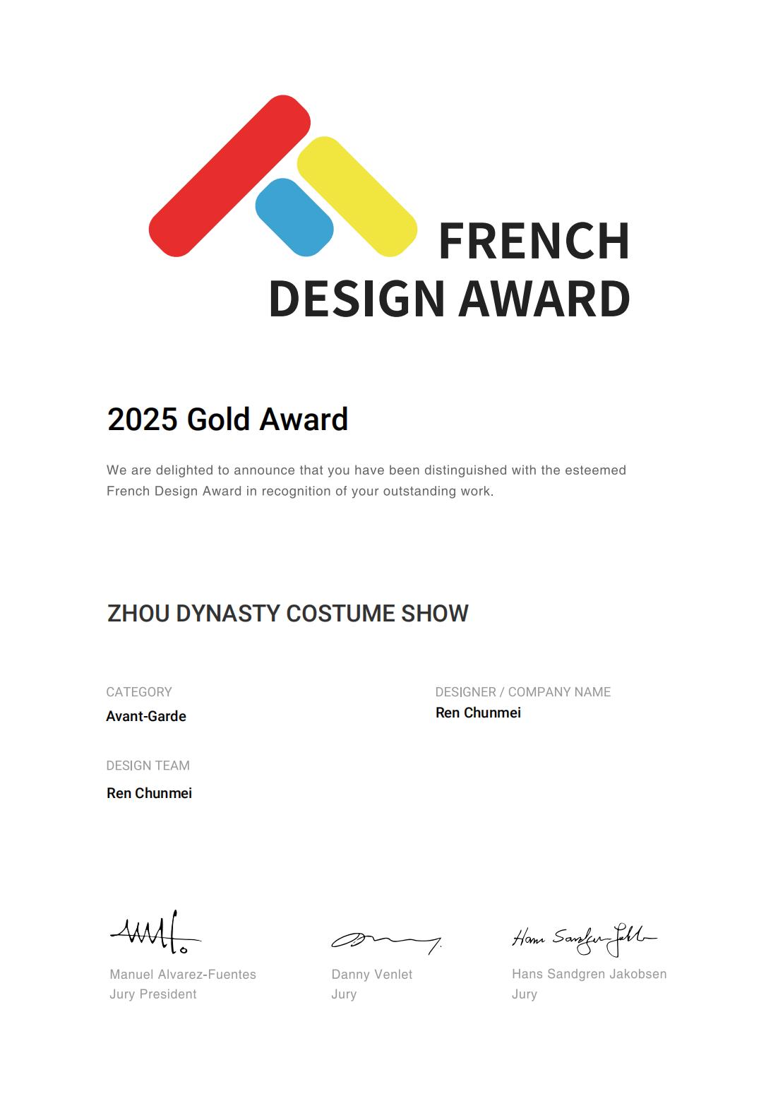 设计师任春美的代表作《周原衣语》在2025年接连获得两大国际顶级设计奖项的权威认可。作品不仅荣获素有"设计界奥斯卡"之称的美国缪斯设计奖(Muse Design Awards)的最高荣誉铂金大奖,同时还斩获了法国设计奖(French Design Awards)最高荣誉金奖。