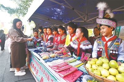 11月15日,广西融水苗族自治县融水镇苗家小镇社区举办第二届“苗集有货·助农共富”助农大集市,集市设立特色农产品区、手工艺品区、民族特色美食区、非遗技艺展示区等,对各乡镇的农特产品和非物质文化遗产进行展示、展销,促进乡村振兴产业发展。图为小学生义卖农特产品和手工艺品。