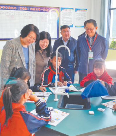 吴志良(右一)在基层小学调研孩子们学习情况