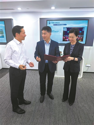 何杰(中)在参加“智能化司法应用研发建设调研座谈会”间隙,与深圳市中级人民法院院长赵菊花(右)及人民法院出版社社长余茂玉(左)交流。