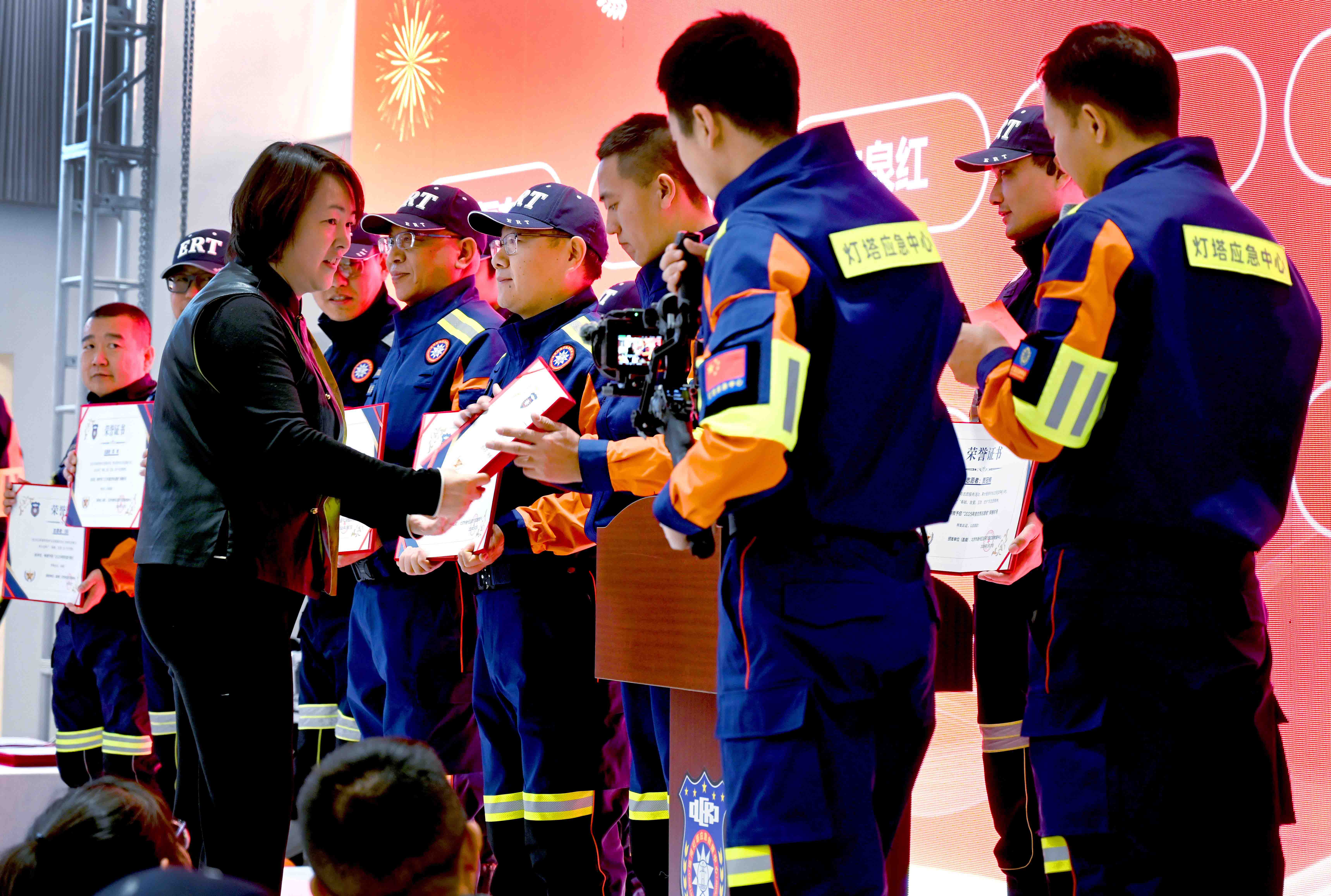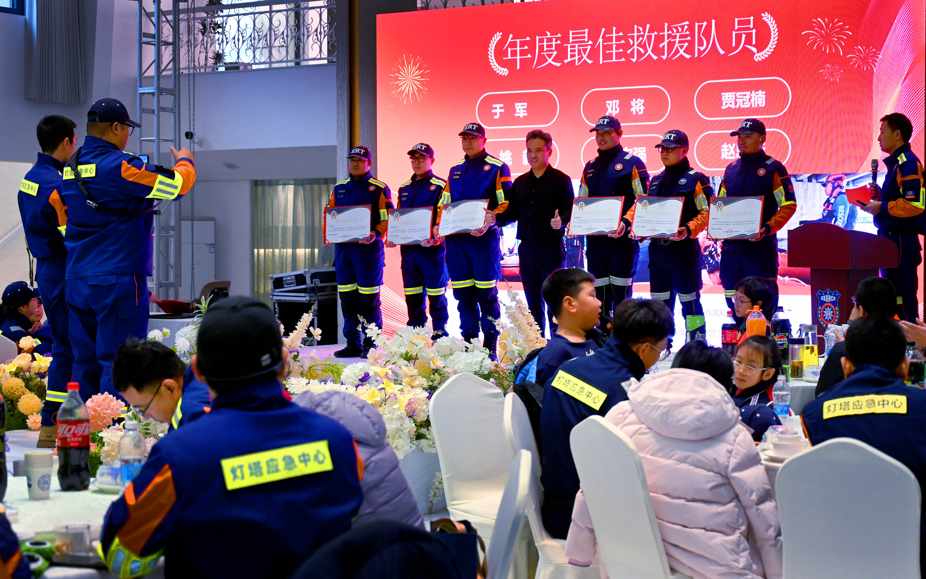 表彰环节中,七大奖项依次揭晓。通州区政协委员为获奖队员颁奖并合影留念。获奖者中既有冲锋在前的救援尖兵,也有默默奉献的后勤保障人员,还有以身作则的政协委员代表。他们或顶风冒雨参与搜救,或倾囊相助支持建设,用实际行动诠释了"灯塔精神"的真谛,展现了政协力量与救援队伍的协同效应。