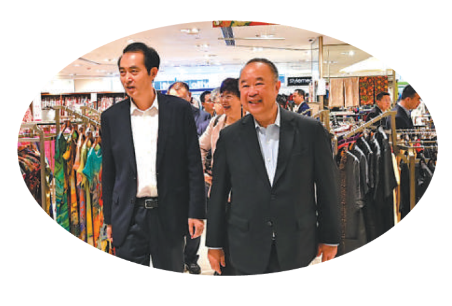 2025年4月,余鹏春(右)陪同宁港澳合作参访团参访裕华国货,希望助推更多优秀中国品牌开拓国际市场。