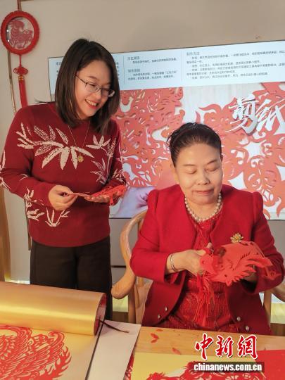 图为伏兆娥(右)和女儿一起剪纸。中新网记者 于晶 摄