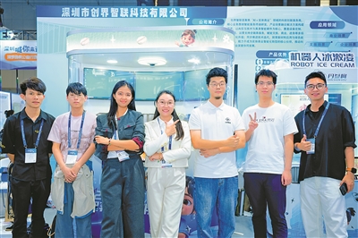 伦雯靖(左三)与其创业团队在第二十七届高交会现场亮相,展示其自主研发的机器人冰淇淋等智能终端设备。