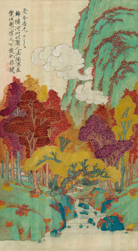 古寺寻秋图(国画)96×181cm 1922年 /金城、吴镜汀、刘子久、李上达、秦仲文、管平湖、胡佩衡、马少轩、陈春耕、韩养痴、姜孝先、朱绳兰、李树智、傅星华、孙诵昭、杨令茀、徐慧、张研农、徐宗浩合作