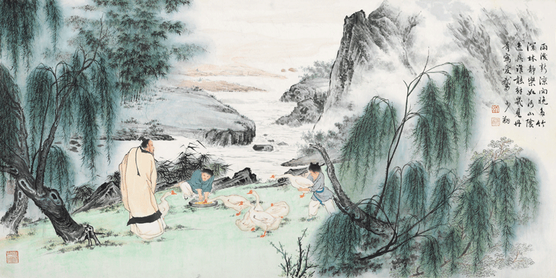 爱鹅图(国画)69×137cm 1991年 /晏少翔