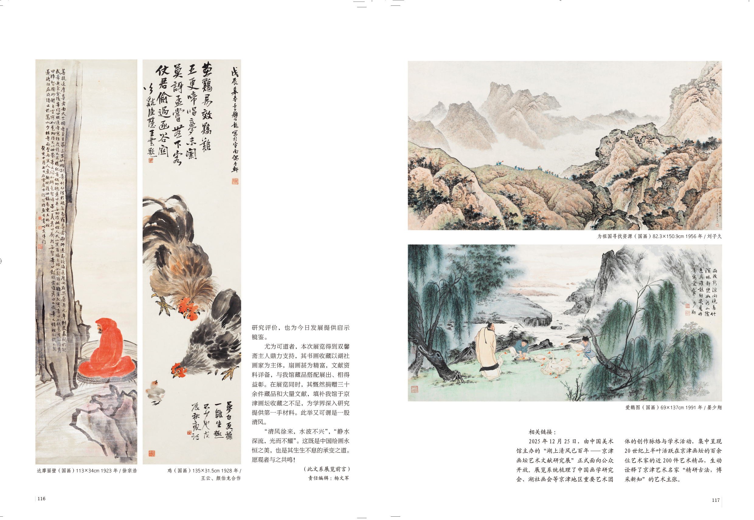 在增强文化自觉、坚定文化自信的当下,中国美术馆举办京津画坛艺术文献研究展,汇集近两百件名家作品,辅助展出大量早期出版文献,勾勒中国画学研究会与湖社画会发展之脉络,在呈现京津画坛整体艺术生态和多元面貌的同时,既重启对他们的研究评价,也为今日发展提供启示镜鉴。