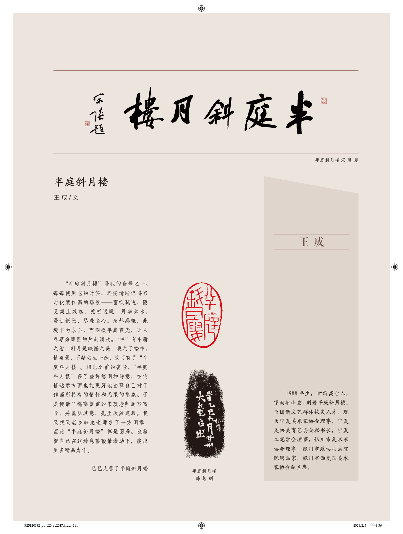 “半庭斜月楼”是我的斋号之一。每每使用它的时候,还能清晰记得当时伏案作画的场景—窗棂疏透,隐见案上残卷,凭栏远眺,月华如水,漫过纸张,尽洗尘心。忽然感慨,此境非为求全,而阁楼半庭霞光,让人尽享余晖里的片刻清欢。“半”有中庸之智,斜月是缺憾之美,我之于楼中,情与景,不禁心生一念,故而有了“半庭斜月楼”。相比之前的斋号,“半庭斜月楼”多了些许悠闲和诗意,在传情达意方面也能更好地诠释自己对于作画所持有的情怀和无限的想象。于是便请了德高望重的宋琰老师题写斋号,并说明其意,先生欣然题写。我又找到老乡韩龙老师求了一方闲章,至此“半庭斜月楼”算是圆满。也希望自己在这种意蕴鞭策激励下,能出更多精品力作。