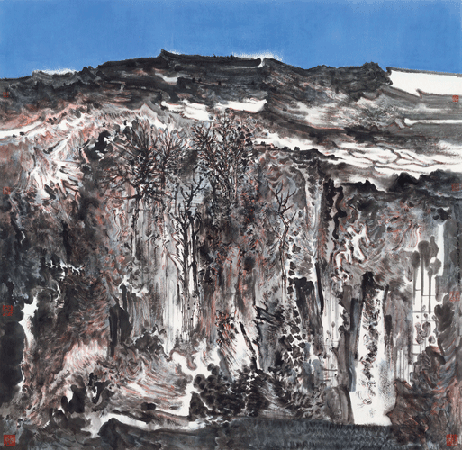 李岗在传统山水画框架内深耕不辍,通过长期实践逐步形成鲜明个人语言。他的艺术之“新”并非颠覆传统,而是在继承基础上的持续创新,具体体现为构图、笔墨等方面的个性化处理,这种沉静专注的创作状态十分可贵,也成为其作品保持纯粹性与思想深度的核心基础。在画面构图上,他以大面积色彩与墨色构建全新视觉平衡,采用饱满甚至略带拥挤的布局增强形式现代感,让水墨语言焕发出蓬勃、难以抑制的生命表现力。笔墨技法方面,他继承了传统水墨皴擦的肌理塑造、破墨的层次渗化、晕染的朦胧意趣,又深入挖掘笔、墨、纸、水相互作用产生的独特韵味,在材料与媒介的对话中探索传统水墨向现代转型的路径,逐渐构建起一套个性化的笔墨语言符号系统。这些符号并非对物象的简单描摹,而是经由主观提炼后重组的视觉表征,使得画面中的山、云、树、石等元素皆带有鲜明的个人印记。这种符号化的处理,不仅强化了作品的辨识度,更让物象超越自然形态,成为承载情感与观念的艺术语言。李岗的创作方式实际上体现了一种“双向对话”:一方面与传统笔墨精神保持内在联结,另一方面在形式语言上回应现代视觉经验。他通过对“水”与“墨”关系的反复实验,既拓展了水墨表达的偶然性与可控性,也让水墨韵味从传统的意境营造手段,转化为具有当代特征的视觉语言。