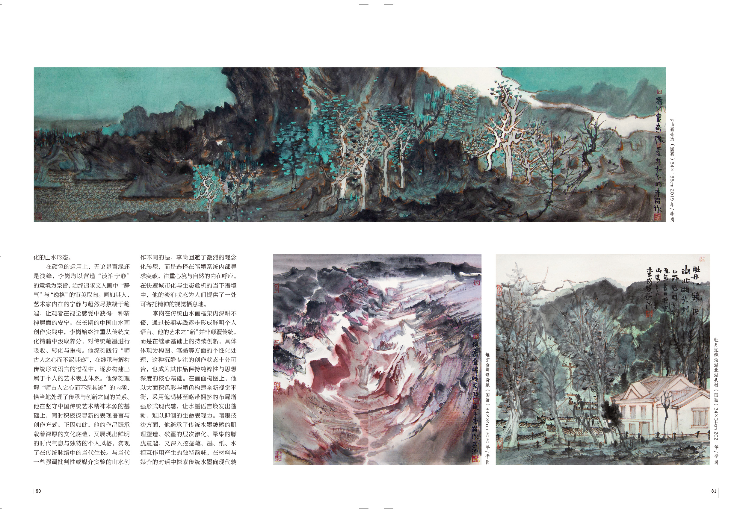 中国画的本质不仅是笔墨技法的展现,更是艺术家与自然、宇宙对话的载体。郭熙在《林泉高致》中提出“山水有可行者,有可望者,有可游者,有可居者”,艺术家在丘壑经营中,完成了一次对生命意义的阐释。艺术家李岗曾说:在毛笔的交错印叠中,灵魂得以迹化;在水墨的交融中,生命得以延伸;在形与色的相生相克中,精神得以升华。这段自白可视为他艺术追求的注脚—在日积月累的创作中,发掘生活的细节,以及自然景物的审美特征,他对白山黑水的直抒胸臆,融入诗性表达,逐渐形成了独特的艺术面貌。