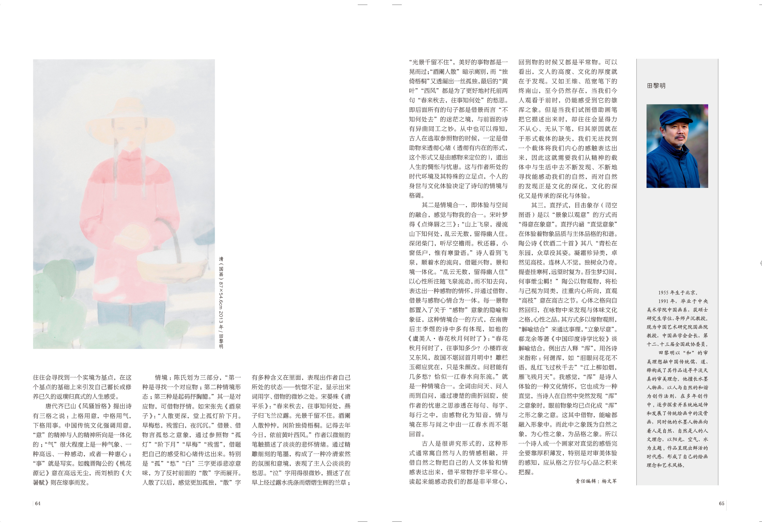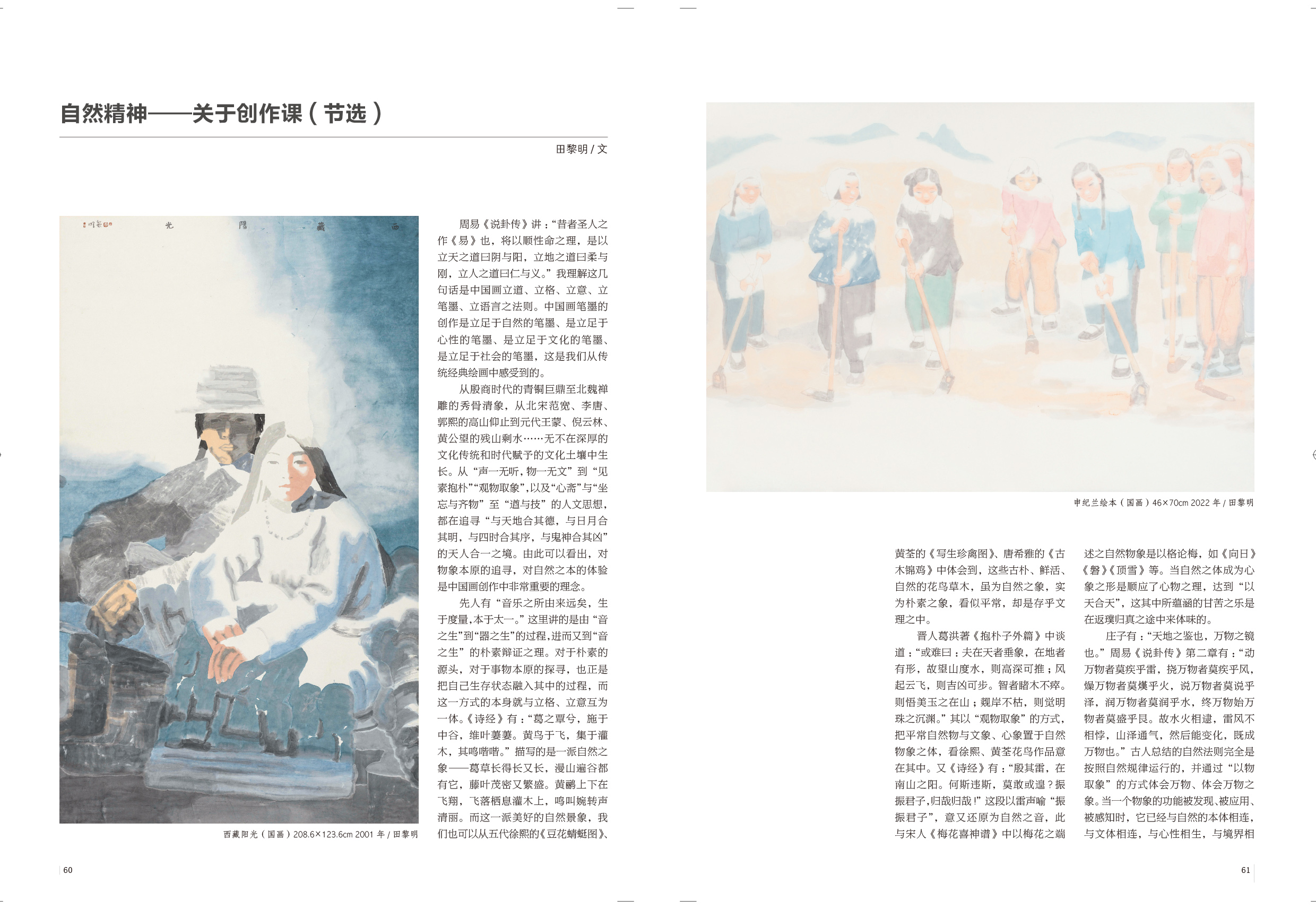 田黎明以“和”的审美理想融中国传统儒、道、释构成了其作品追寻平淡天真的审美理念。他擅长水墨人物画,以人与自然的和谐为创作法则,在多年创作中,逐步探索并系统地延伸和发展了传统绘画中的没骨画,同时他的水墨人物画向着人是自然、自然是人的人文理念,以阳光、空气、水为主题,作品呈现出鲜活的时代感,形成了自己的绘画理念和艺术风格。
