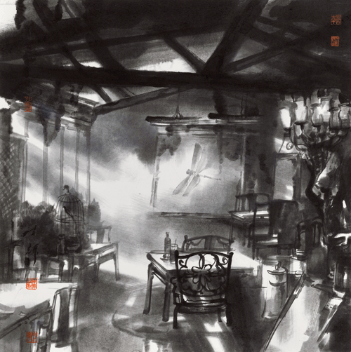 两棵树小院里的咖啡时光(国画)69×69cm /陈 辉