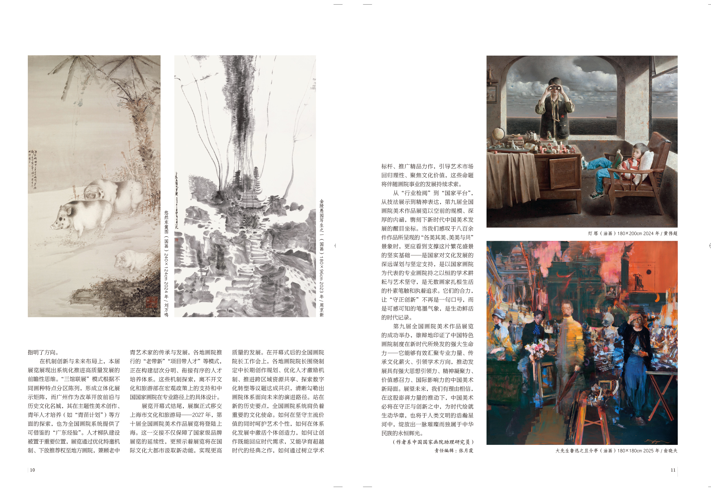 第九届全国画院美术作品展览的成功举办,雄辩地印证了中国特色画院制度在新时代所焕发的强大生命力—它能够有效汇聚专业力量、传承文化薪火、引领学术方向,推动发展具有强大思想引领力、精神凝聚力、价值感召力、国际影响力的中国美术新局面。展望未来,我们有理由相信,在这股澎湃力量的推动下,中国美术必将在守正与创新之中,为时代绘就生动华章,也将于人类文明的浩瀚星河中,绽放出一脉璀璨而独属于中华民族的永恒辉光。