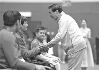 全国政协常委、中国残联主席程凯(右)看望残特奥会香港赛区运动员