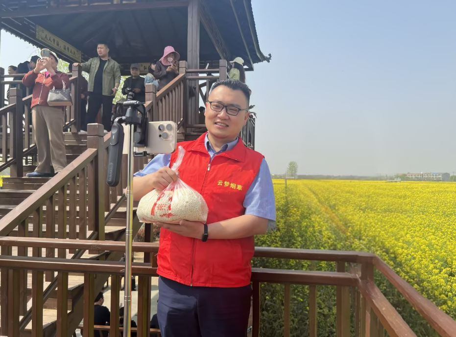 每年春天,湖北省孝感市云梦县胡金店镇都会迎来一年一度的油菜花海节。万亩油菜花竞相绽放,金黄色的花海吸引八方游客。花海旁,一群身穿红马甲的志愿者格外忙碌——他们是云梦县烟草专卖局“云家”志愿服务队。炸米炮、卖土特产、直播带货……他们用最接地气的方式,帮助农户把“云梦味道”推介给八方来客,把真金白银装进村民口袋。