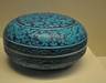 此梅瓶呈梨形,器表纹饰是用泥釉勾勒出凸起的轮廓,然后在轮廓内用绿松石色和黄色釉填涂,与蓝色背景形成鲜明对比。蓝釉刻龙纹圆盒(明·成化·江西景德镇)