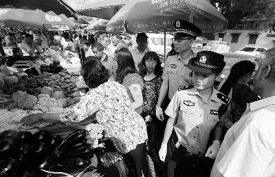 民警首次在早市巡逻 摄/法制晚报记者 曹博远