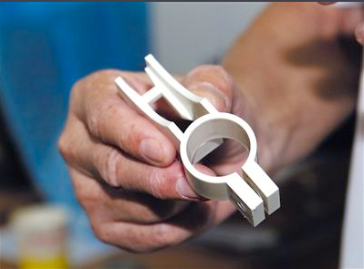 节水器为乳白色,由两个呈半圆形的塑料和一根螺丝组成,两个半圆拼在一起套在马桶出水口的立杆上,可以控制出水口塞子的开口角度,以此达到节水的效果。