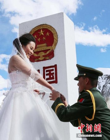 7月30日,位于新疆塔什库尔干县5100米中巴边境的7号界碑前,武警新疆边防总队红其拉甫边防检查站为5名长年坚守在高原的军官们举办了具有特殊意义的集体婚礼。当日,武警新疆边防总队红其拉甫边防检查站的5对新人通过互换定情物、同喝交杯酒、在国门前留下幸福脚印、在界碑前许下真爱诺言的方式举行了集体婚礼。中新社发 位永超 唐乾清 摄 图片来源:CNSPHOTO