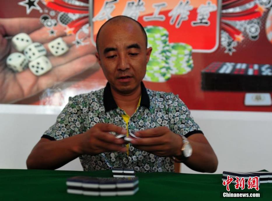 8月12日,龙祥在他的反赌工作室,逐一演示赌场中最常见的几种“千术”。龙祥,来自天津,曾为赚钱出入赌场十多年;在他了解了赌场中的许多内情,看到赌桌上的种种“千术”后,如今他大转身份,在石家庄成立一家反赌工作室,成为一名反赌人士。并决心通过自身的经历,揭秘赌场上的千术,帮助那些沉迷赌博的人悬崖勒马,戒除赌瘾。据其介绍,反赌工作室已成功帮助来自北京、山西、河南等各地的四十余人戒赌。图为高科技“千术”赌具,通过特制眼镜可看到扑克牌背面的数字。中新社发 翟羽佳 摄