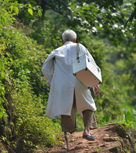 一位头发全白的老者,身着白大褂,拄着拐杖,背着医药箱,在山路上蹒跚前行。红花村长大的每个人心中都印着这样一个背影。
