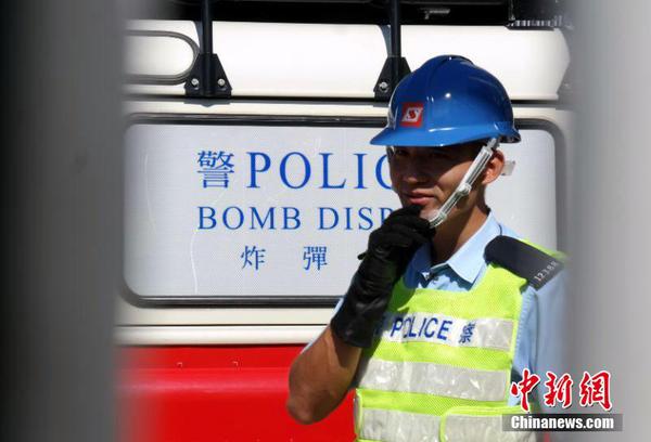 8月26日,香港北角海港道一个建筑工地,发现疑似战时炸弹,大批警方爆炸品处理课人员到场视察,消防员亦到场戒备。受事故影响,北角码头周围一带需要暂时封闭。中新社发 张宇 摄