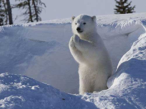 这只北极熊宝宝从它的冰洞出来后,两条腿站着向镜头挥舞手臂,似乎是在和摄影师打招呼;随后它又将两只熊掌合拢,可能是想把身上的雪抖掉,但看起来像是在拱手作揖,有趣极了。