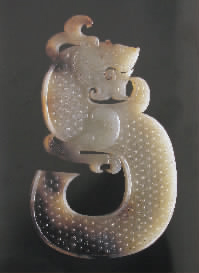 如图5,为狮子山楚王陵出土的玉龙,长17.5厘米,宽10.2厘米,以新疆和田白玉雕琢而成,晶莹有玻璃般光泽,造型为单体龙,张须露齿,双目圆睁,把龙潜深渊、蛰伏待时的意蕴刻画得淋漓尽致。玉龙眼睛下方有一钻孔,为佩戴时的细穿用孔,表明这件玉龙为配饰。