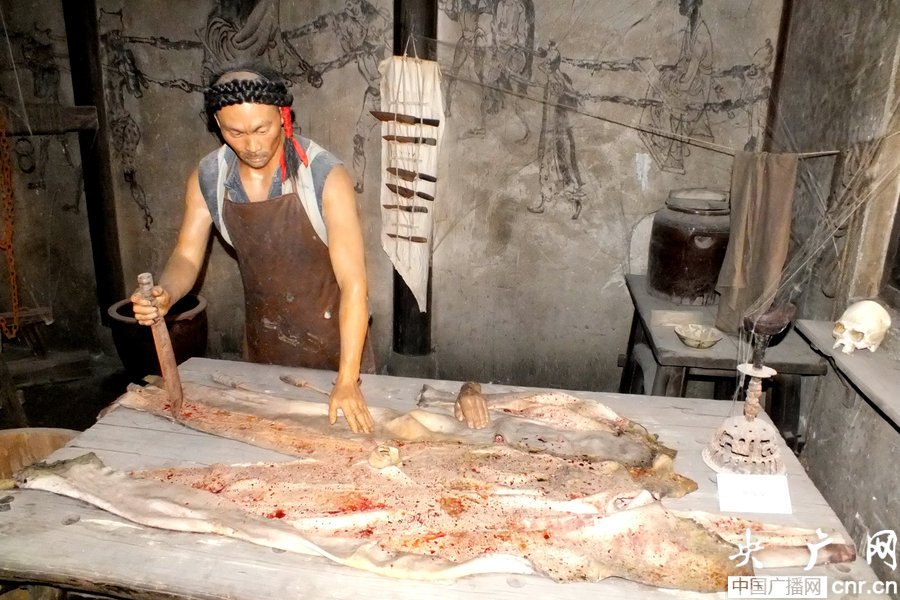 这里是皮场庙的一个工作坊。里面陈设的是剥皮凳,剥皮刀具,剥下的人皮放在石灰水的大缸里。这里就是执行剥皮楦草的地方。