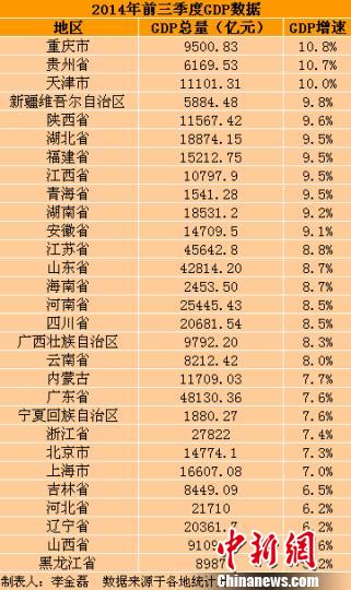 中新网记者根据已公布数据梳理发现,在这29个省份中,重庆前三季度GDP增速最高,为10.8%,贵州以10.7%的增速排名第二,天津(10%)第三,黑龙江(5.2%)垫底。