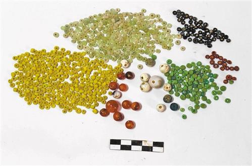 翡翠绿、玛瑙红、香蕉黄……记者在保管出土器物的库房内看到,五彩斑斓的串珠密密麻麻地铺散开来。其中,最小的如米粒大小,其穿孔如针眼一般;最大的直径也不过1厘米。本次共发现2000多颗大大小小的串珠,全部出土自一座六朝时期的墓葬。据推测,串珠大多为琉璃质地,红色的有可能是玛瑙,白色、绿色则有玉的成分。