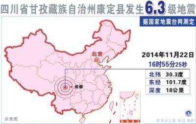 据中国地震台网测定:11月22日16时55分,四川省甘孜藏族自治州康定县(北纬30.3度,东经101.7度)发生6.3级地震,震源深度18公里。