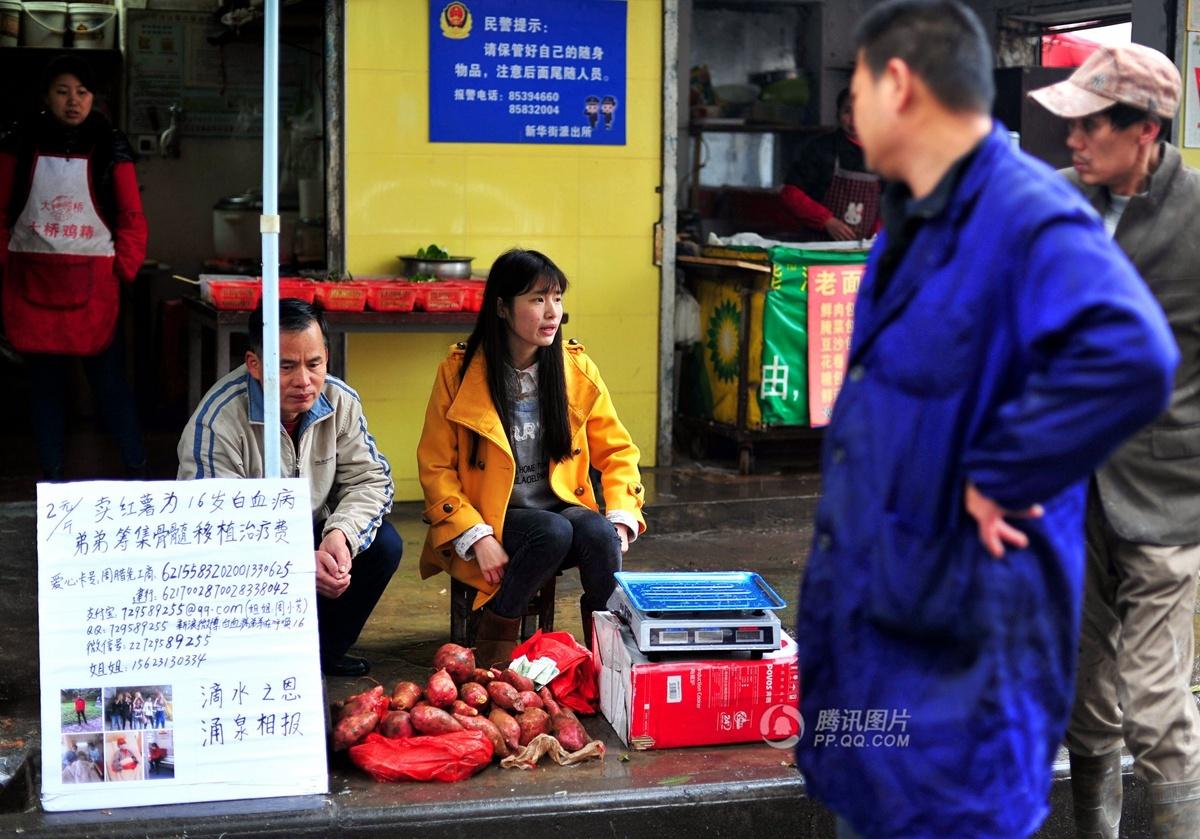 2014年11月27日,周小芳和父亲守在武汉协和医院附近的精武横路菜场售卖家乡产的红薯。希望能够尽快帮身患白血病的弟弟尽快筹到骨髓移植的医疗费。巴石 摄