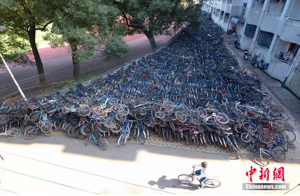 12月22日,湖南一高校操场旁的宿舍楼前,成百上千的废弃自行车堆积如山,从高空俯瞰,犹如一个大型的“自行车坟场”。校内部分学生建议学校将这些自行车统一回收,进行翻新处理,捐赠给贫困生或者变成校园公共自行车。杨华峰 摄