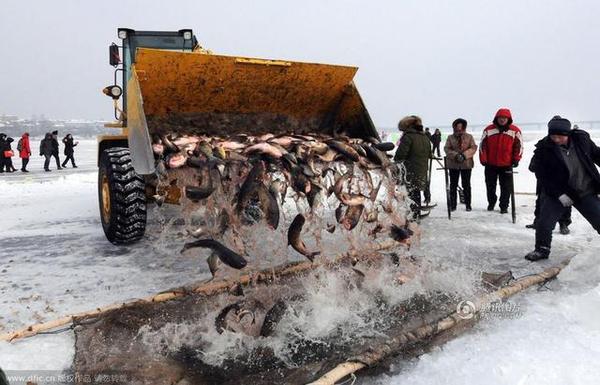12月28日,冰城哈尔滨市道里区首届长岭湖冬捕冰钓旅游节在长岭湖国际冰钓场开幕,在冬捕区,500米长的“拉网”在渔民和拖拉机的共同努力下被缓缓拉出冰面,图为铲车将鱼倒在浸在水里的网上,等待出售。刘洋摄