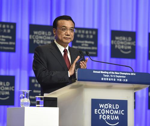 —2014年9月10日,国务院总理李克强在2014夏季达沃斯论坛开幕式上发表致辞。