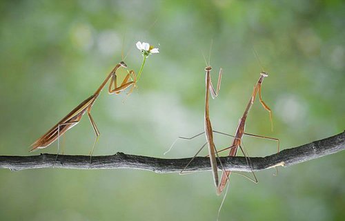 这一幕是沙乌在自家住房附近的树丛中发现的。当时一只螳螂站在树枝上,前肢中捧着一朵白色鲜花,似乎要献给它的爱人。而雌性螳螂被看到向捧花螳螂屈身,似乎接受了对方的求爱。可是,树枝上又出现第三只螳螂。