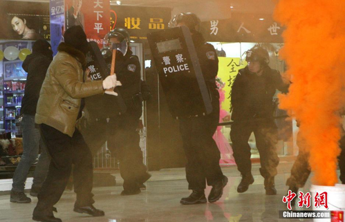 1月28日,参演民警正在白碱滩区三环商贸中心制服“暴徒”。当日,新疆克拉玛依市白碱滩区公安分局在三环商贸中心举行防暴力恐怖应急演练,来自分局巡警、刑侦、治安、巡逻防控、交警等警种和店店联防队参与演练,此次演练旨在提升辖区各警种之间的配合协调能力、快速处置能力和现场应变能力以及市民自保自救能力,确保节日期间社会面的安定和谐和群众生命财产安全。中新社发周建玲 摄 图片来源:CNSPHOTO