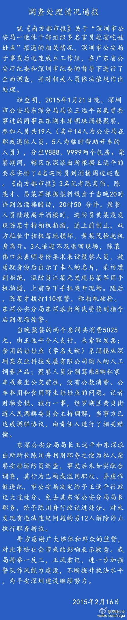 @深圳公安【调查处理情况通报】就《南方都市报》关于“深圳市公安局一退休干部组织多名官员赴宴吃娃娃鱼”报道的相关情况,深圳市公安局于事发后迅速成立工作组,在广东省公安厅纪委和深圳市纪委的督导下进行了全面调查,并对相关人员依法依规作出处理。
