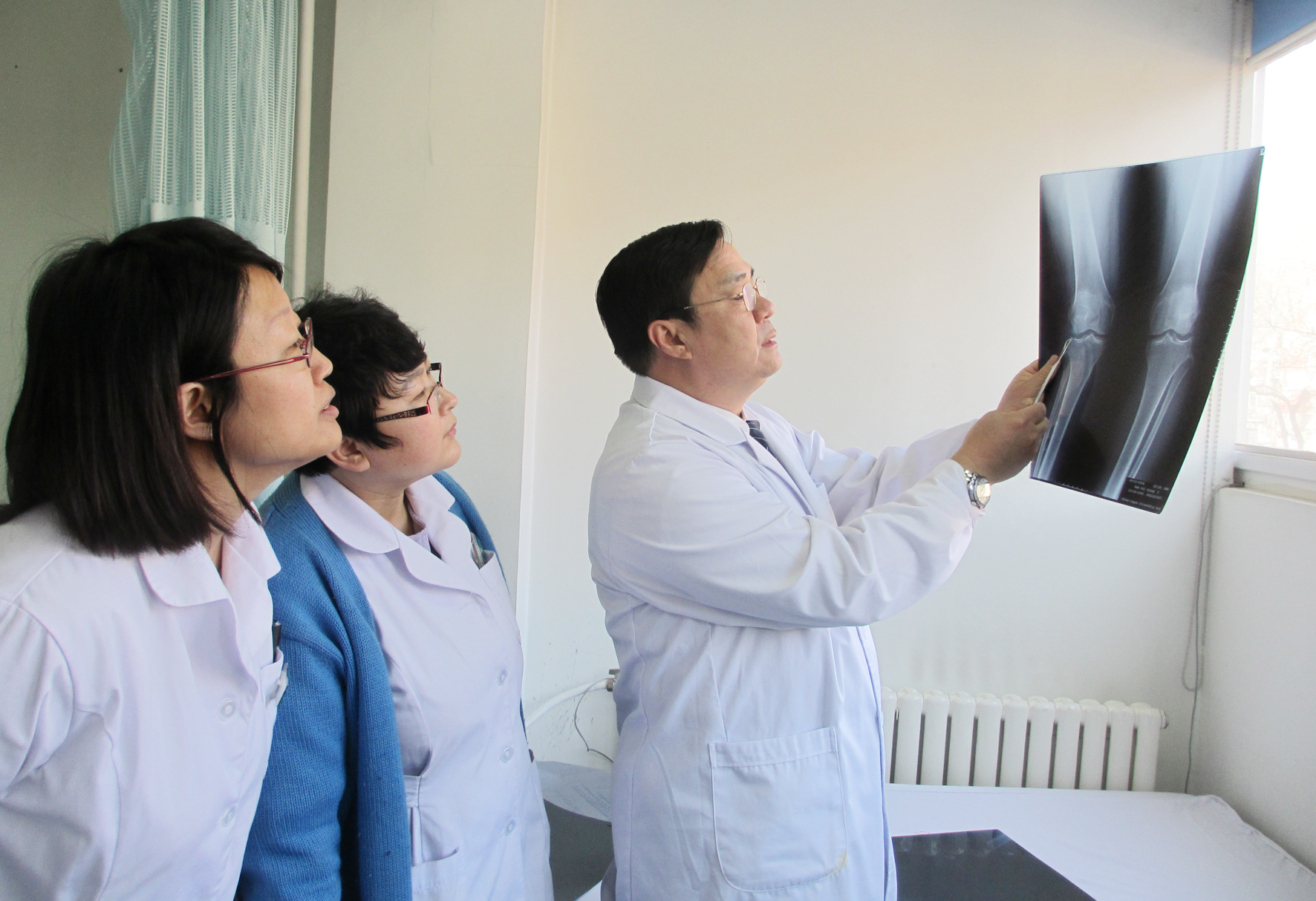 温建民委员(右)指导学生杨春苹(左)和卢晨看X光片。摄影 本报记者 李木元