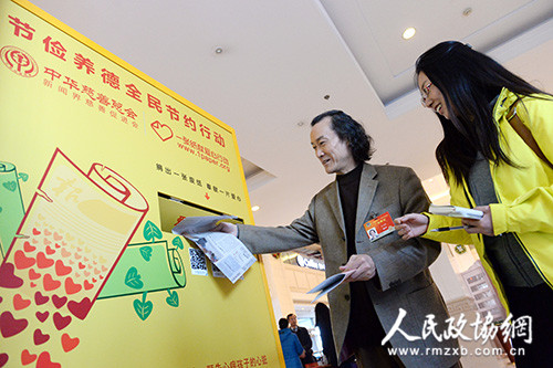 在今年的全国两会驻地,出现了由中华慈善总会等设立的“一张纸献爱心”活动募捐箱。鼓励代表和委员将看过的报纸捐赠出来救助困难群体。图为徐利明委员把看过的报纸放到“捐出一张废纸、奉献一片爱心”活动募捐箱中。 本报记者 贾宁 摄