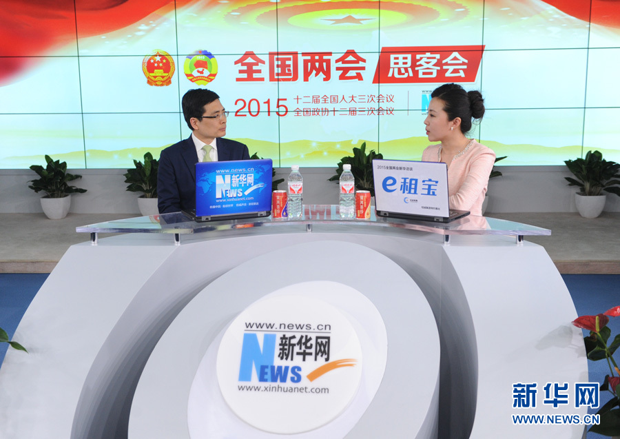 2015年3月7日,全国人大代表,海尔集团轮值总裁周云杰做客新华网访谈间,谈创新创客成为企业发展的新动力。图为周云杰与主持人对话。 新华网 陈竞超 摄