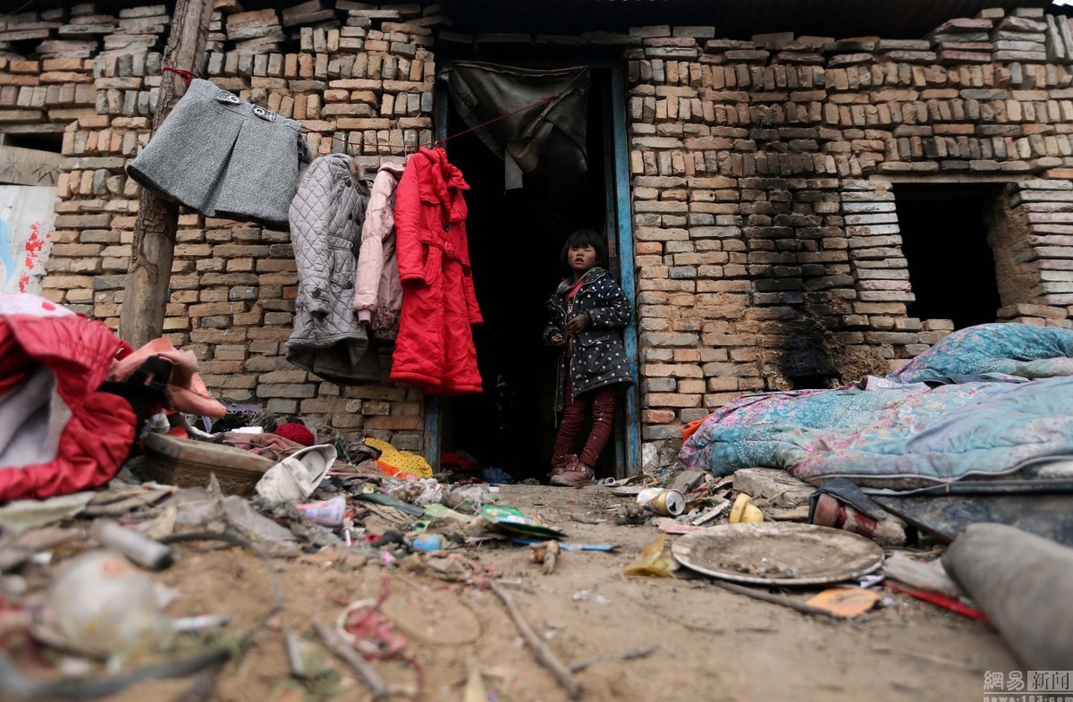 运城安邑火车站是一个小镇上的火车站,辛卓村就离此不远,村里的地大部分都已经被空港经济开发区征用了,杨园园家里只有1亩多的地。地里简陋的房屋和四处乱扔的垃圾就是杨园园家里6口人居住的家。图为2015年3月10日,山西省运城市,杨甜甜站在家门口,说是家,其实就是搭建的窝棚。