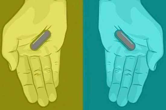 如果在图中看到的是蓝色和红色的药片就大错特错了。其实这两颗药片都是灰色的。人们之所以认为药片为红色和蓝色是由于人脑会根据药片外部的颜色信息对 药片颜色进行判断。同理,同一个魔方在不同的背景色下也有不同的颜色效果。在黄色背景下,蓝色色块较为突出;在蓝色背景下,黄色色块较为突出。
